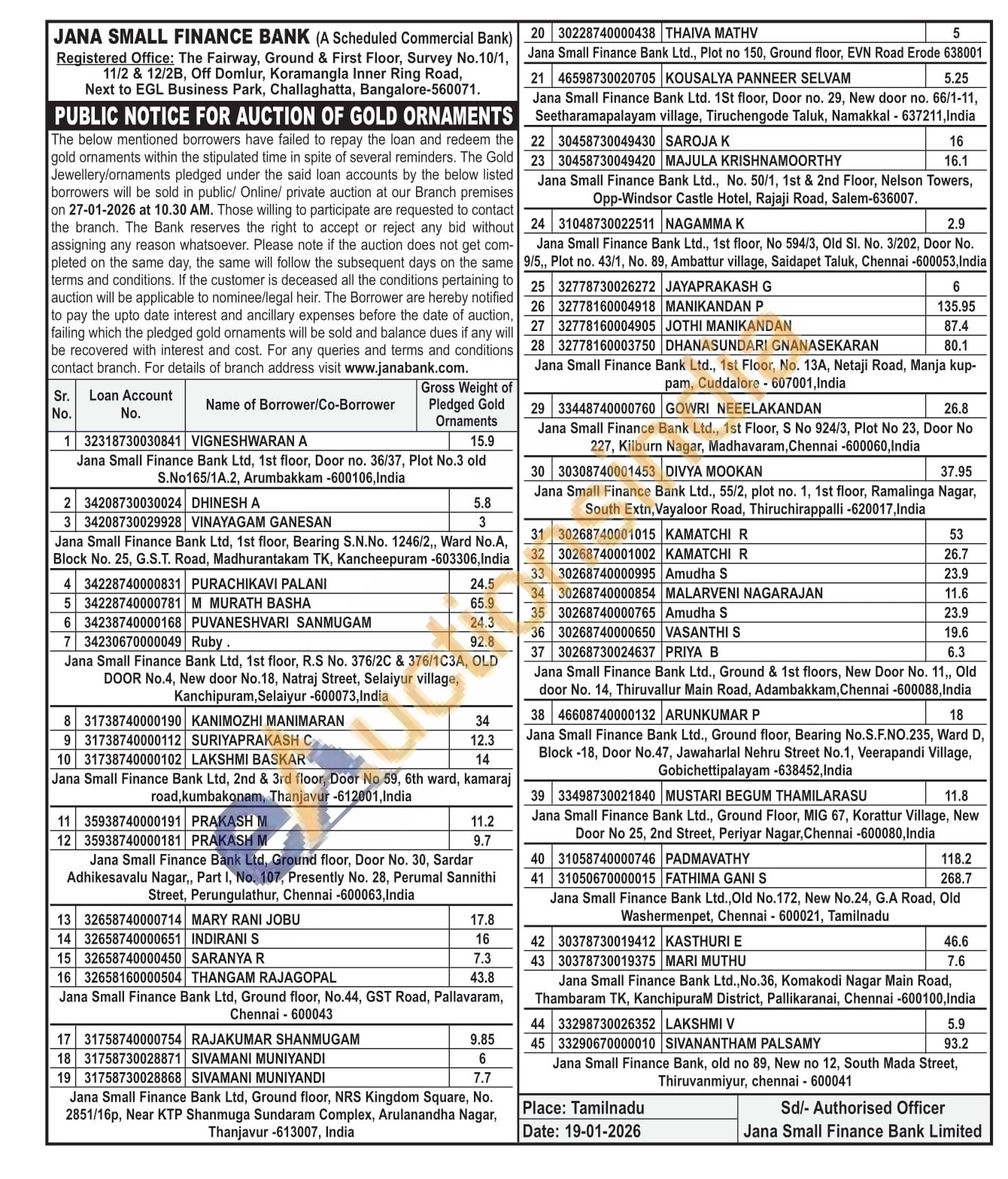 Jana Small Finance Bank Gold Auctions Auction in Bengaluru