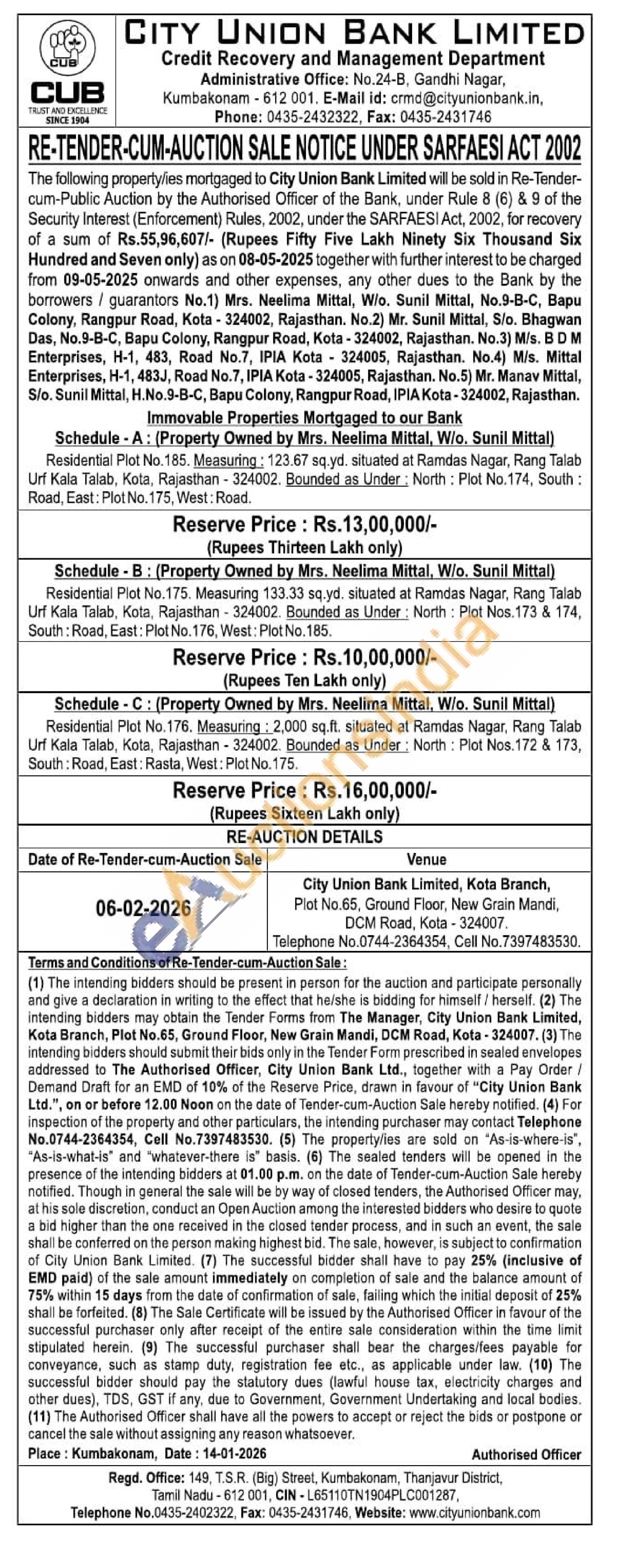 Schedule - A: (Property Owned by Mrs. Neelima Mittal, W/o. Sunil Mittal) Residential Plot No. 185. Measuring: 123.67 sq.yd. situated at Ramdas Nagar, Rang Talab Urf Kala Talab, Kota, Rajasthan - 324002. Bounded as Under: North: Plot No.174, South: Road, East: Plot No. 175, West: Road