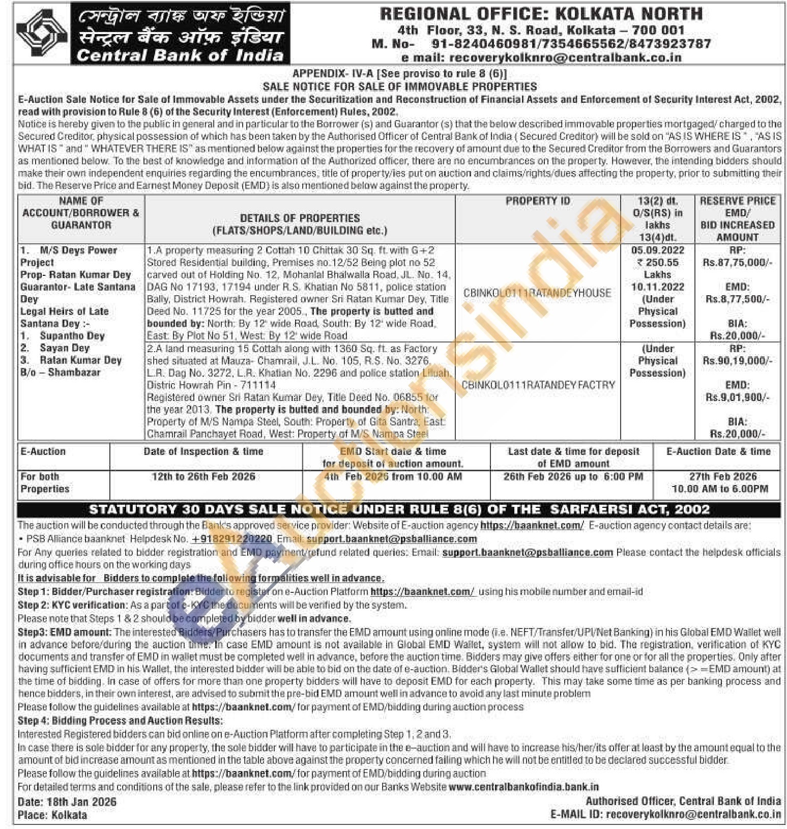 1.A property measuring 2 Cottah 10 Chittak 30 Sq. ft. with G+2 Stored Residential building, Premises no.12/52 Being plot no 52 carved out of Holding No. 12, Mohanlal Bhalwalla Road, JL. No. 14, DAG No 17193, 17194 under R.S. Khatian No 5811, police station Bally, District Howrah. Registered owner Sri Ratan Kumar Dey, Title Deed No. 11725 for the year 2005., The property is butted and bounded by: North. By 12 wide Road, South: By 12' wide Road, East: By Plot No 51, West: By 12 wide Road