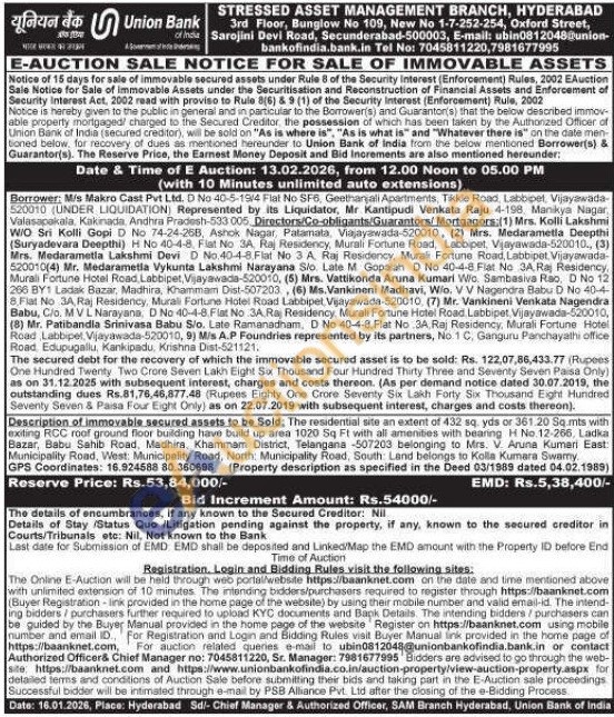 Description of immovable secured assets to be Sold: The residential site an extent of 432 sq, yds or 361.20 Sq.mts with exiting RCC roof ground floor building have build up area 1020 Sq Ft with all amenities with bearing H No. 12-266, Ladka Bazar, Babu Sahib Road, Madhira, Khammam District, Telangana -507203 belonging to Mrs. V Aruna Kumeri East Municipality Road, West: Municipality Road, North: Municipality Road, South: Land belongs to Koilla Kumara Swarmy.