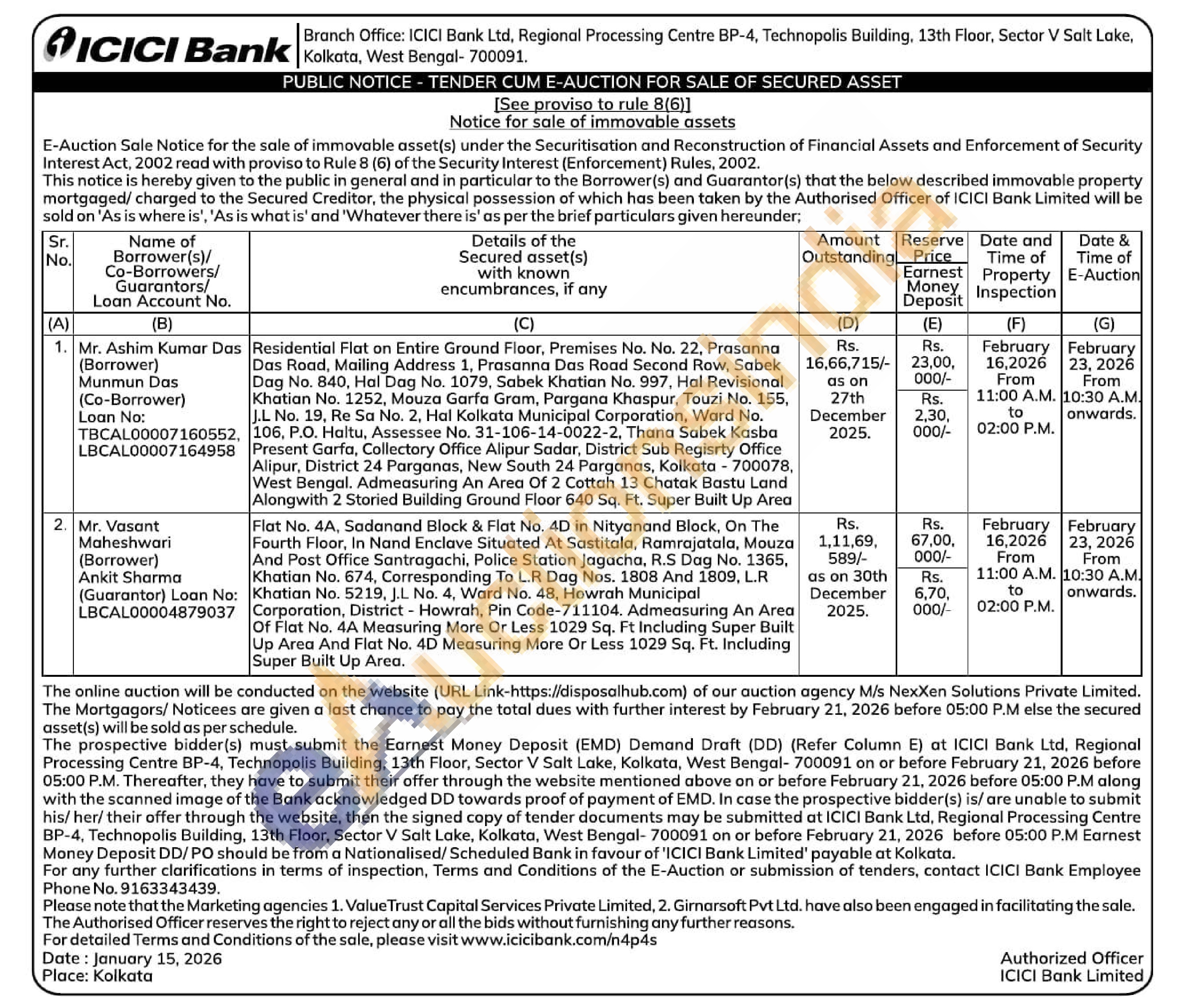 Flat No. 4A, Sadanand Block & Flat No. 4D in Nityanand Block, On The Fourth Floor, In Nand Enclave Situated At Sastitala, Ramrajatala, Mouza And Post Office Santragachi, Police Station Jagacha, R.S Dag No. 1365, Khatian No. 674, Corresponding To L.R Dag Nos. 1808 And 1809, L.R Khatian No. 5219, J.L No. 4, Ward No. 48, Howrah Municipal Corporation, District - Howrah, Pin Code-711104. Admeasuring An Area Of Flat No. 4A Measuring More Or Less 1029 Sq. Ft Including Super Built Up Area And Flat No. 4D Measuring More Or Less 1029 Sq. Ft. Including Super Built Up Area