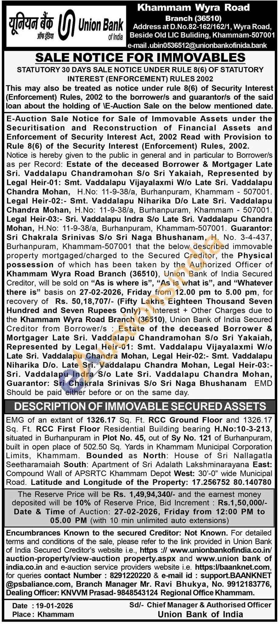Branch Manager Mr. Ravi Bhukya, No : 9912183776 / Dealing Officer: KNVVM Prasad-9848543124