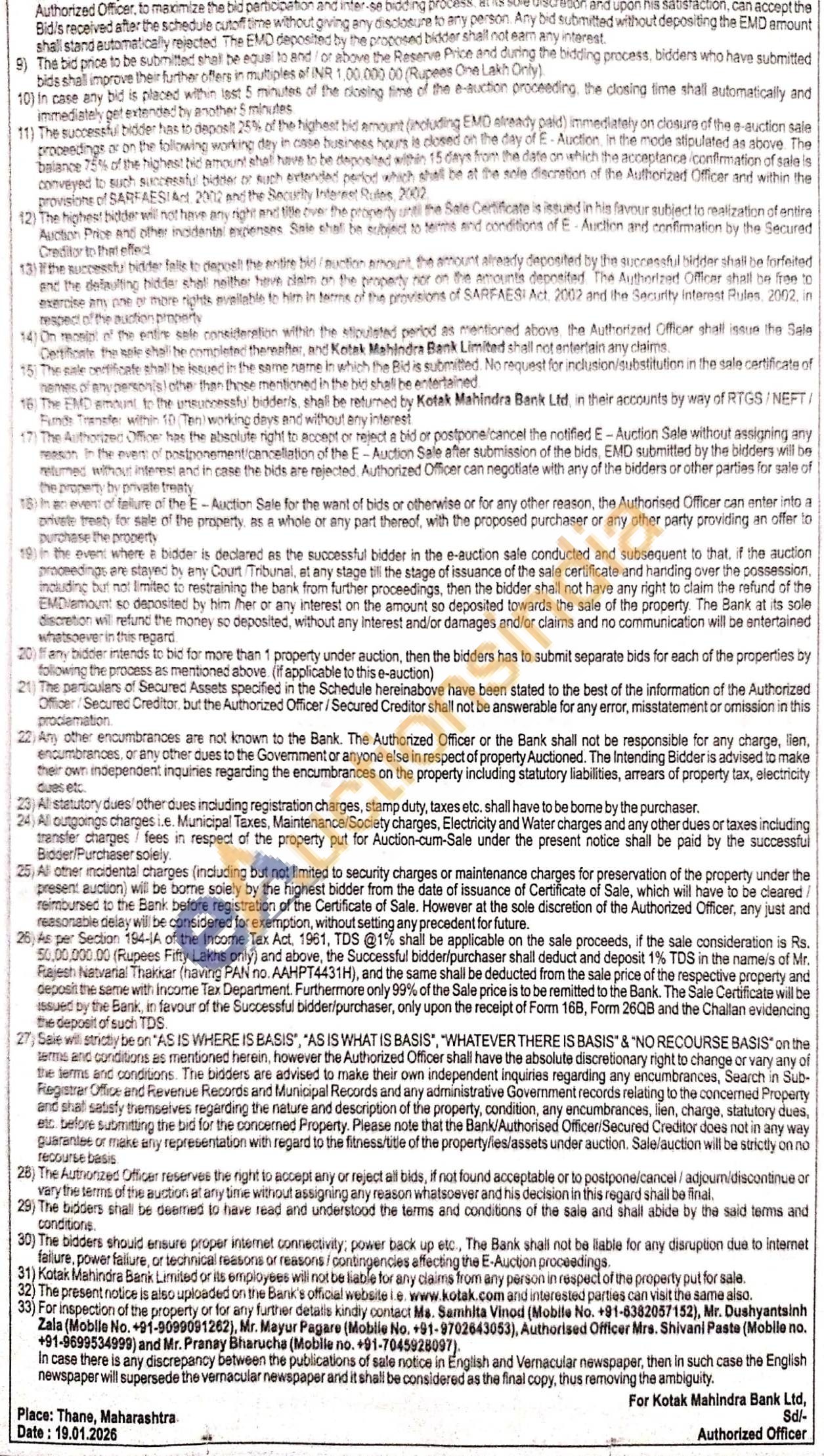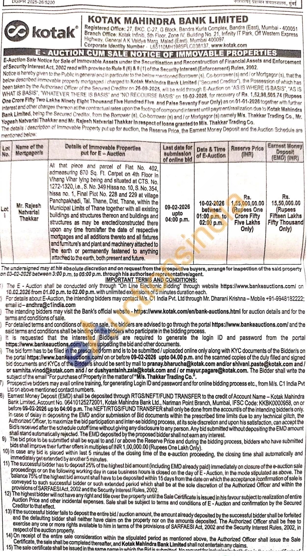 All that piece and parcel of Flat No. 402, admeasuring 670 Sq. Ft. Carpet on 4th Floor in Vihang Vihar lying being and situated at CTS. No. 1272-1320, l.e., S. No. 349 Hissa no. 10, S. No. 354, hissa no. 1, Final Plot No. 228 and 229 at village Panchpakhadi, Tal. Thane, Dist. Thane, within the Municipal Limits of Thane together with all existing buildings and structures thereon and buildings and structures as may be erected/constructed there upon any time from/after the date of respective mortgages and all additions thereto and all fixtures and furniture's and plant and machinery attached to the earth or permanently fastened to anything attached to the earth, both present and future.