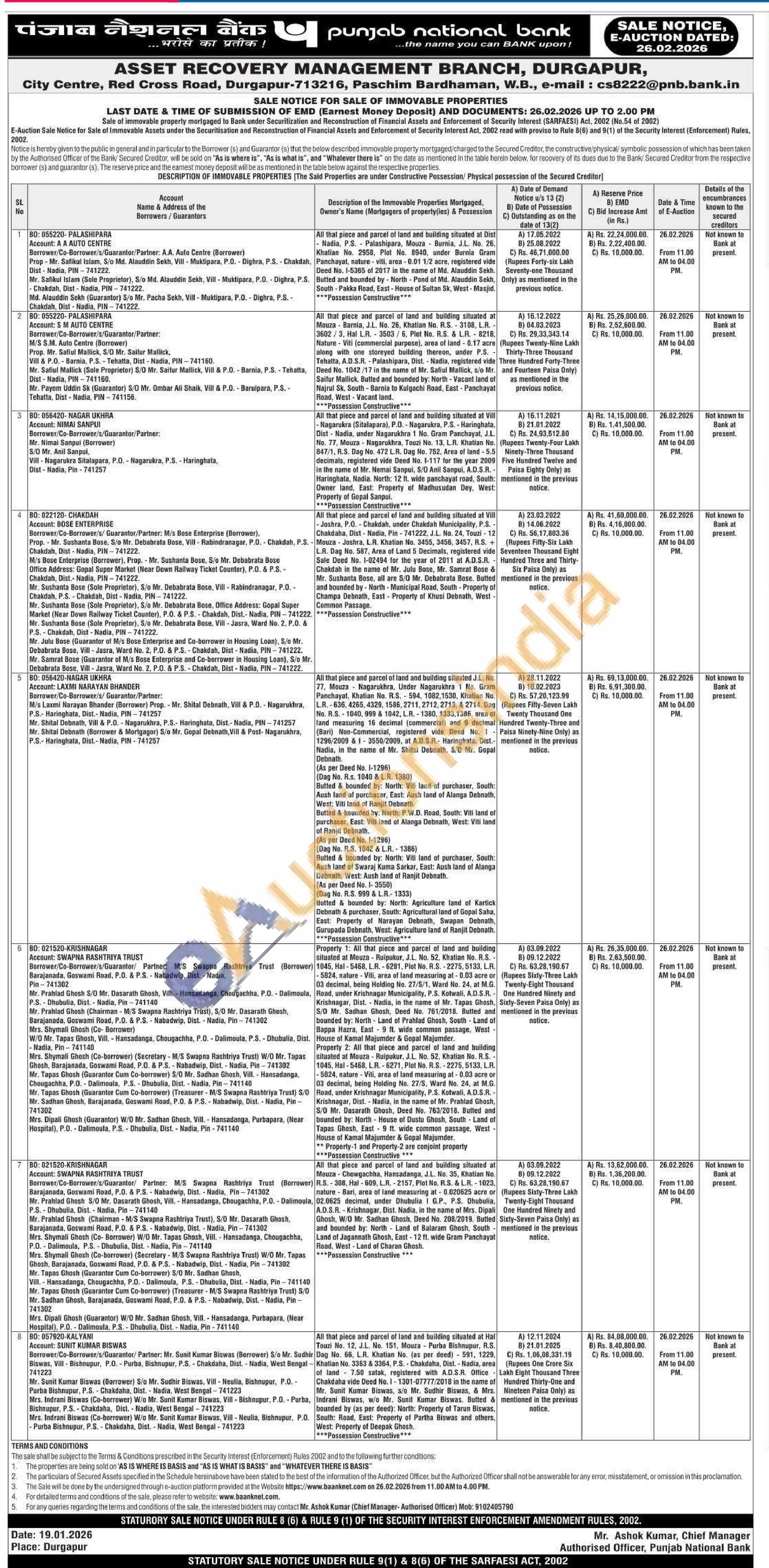 All that piece and parcel of land and building situated at Hal Touzi No. 12, J.L. No. 151, Mouza Purba Bishnupur, R.S. Dag No. 66, L.R. Khatian No. (as per deed) 591, 1229, Khatian No. 3363 & 3364, P.S. - Chakdaha, Dist. Nadia, area of land 7.50 satak, registered with A.D.S.R. Office Chakdaha vide Deed No. 1-1301-07777/2018 in the name of Mr. Sunit Kumar Biswas, s/o Mr. Sudhir Biswas, & Mrs. Indrani Biswas, w/o Mr. Sunit Kumar Biswas. Butted & bounded by (as per deed): North: Property of Tarun Biswas, South: Road, East: Property of Partha Biswas and others, West: Property of Deepak Ghosh.