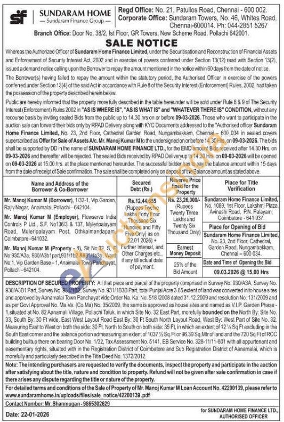 DESCRIPTION OF SECURED PROPERTY: All that piece and parcel of the property comprised in Survey No. 930/A3A, Survey No. 930/A381 Part, Survey No. 931/182, Survey No. 931/1838 Part, total Punjai Acre 3.85 extent of land was converted in to house sites and approved by Aanamalai Town Panchayat vide Order Na. Ka. No. 518/2008 dated 31.12.2009 and resolution No. 131/2009 and as per Govt Approval No. Ma. Va. (Co. Ma) No. 35/2009, the same is approved as house sites and named as VIP. Garden Phase-1, situated at No. 82 Aanamali Village, Pollachi Taluk, in which Site No. 32 East Part, morefully bounded on the North By: Site No. 33, South By: 30 Ft wide, East West Layout Road East By: 30 Ft South North Layout Road, West By: West Part of Site No. 32. Measuring East to West on both the side: 30 Ft, North to South on both side: 35 Ft, in which an extent of 12% Sq Ft excluding in the South East comer and the balance portion admeasuring an extent of 1037% Sq. Ftor 96.39 Sq. Mtr of land and the 720 Sq Ft of RCC building builtup there on bearing Door No. 1/32, Tax Assessment No. 5141, EB Service No. 328-11/11-801 with all appurtenant and easementary rights, situated with in the Registration District of Coimbatore and Sub Registration District of Aanamalai, which is morefully and particularly described in the Title Deed No. 1372/2012