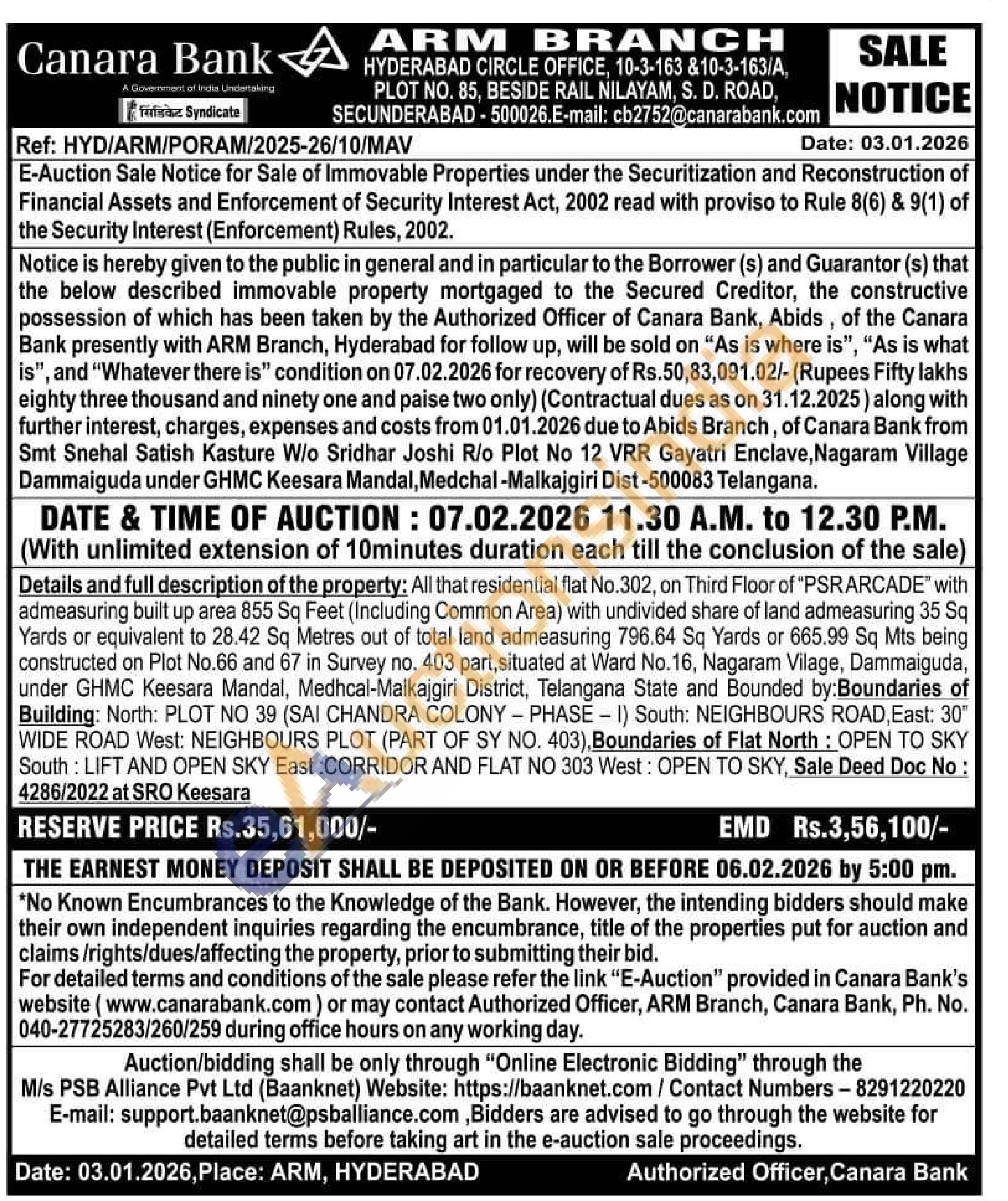 All that residential flat No.302, on Third Floor of "PSRARCADE" with admeasuring built up area 855 Sq Feet (Including Common Area) with undivided share of land admeasuring 35 Sq Yards or equivalent to 28.42 Sq Metres out of total land admeasuring 796.64 Sq Yards or 665.99 Sq Mts being constructed on Plot No.66 and 67 in Survey no. 403 part, situated at Ward No.16, Nagaram Vilage, Dammaiguda, under GHMC Keesara Mandal, Medhcal-Malkajgiri District, Telangana State and Bounded by:Boundaries of Building: North: PLOT NO 39 (SAI CHANDRA COLONY - PHASE - I) South: NEIGHBOURS ROAD, East: 30" WIDE ROAD West: NEIGHBOURS PLOT (PART OF SY NO. 403), Boundaries of Flat North: OPEN TO SKY South: LIFT AND OPEN SKY East: CORRIDOR AND FLAT NO 303 West: OPEN TO SKY, Sale Deed Doc No: 4286/2022 at SRO Keesara