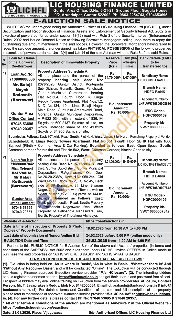 All the piece and the parcel of the property bearing sale deed No: 2376/2020, Guntur District, Koritepadu Sub Division, Gorantla Grama Panchayat, Guntur Municipal Corporation, bearing Flat No.504. Fourth Floor, K. Linga Reddy Towers Apartment, Plot Nos.1,2, & D No.134, 10th Line, Balaji Nagar Main Road, Guntur to Amaravathi Road, Gorantla, Guntur Municipal Corporation, A P-522 034, with an extent of 836.1/4 Sq.yds or 699.2137 Sq.mtrs of site, on which Undivided share of land 41.8125 Sq.yds or 34.960 Sq.mtrs of site.Bounded as Follows; East: 30'ft wide Road, South: Plot No.4, West: Vacant Site, North: Remaining Property of Vendor. Schedule-B: K. Linga Reddy Towers Apartment, Flat No.504, Fourth Floor, 2BHK Flat with 1060 Sq. feet (Plinth Common Area & Car Parking). Bounded as follows: East: Open Space, South: Common corridor for this flat and Flat No.502, West: Common Corridor, North: Open to sky.