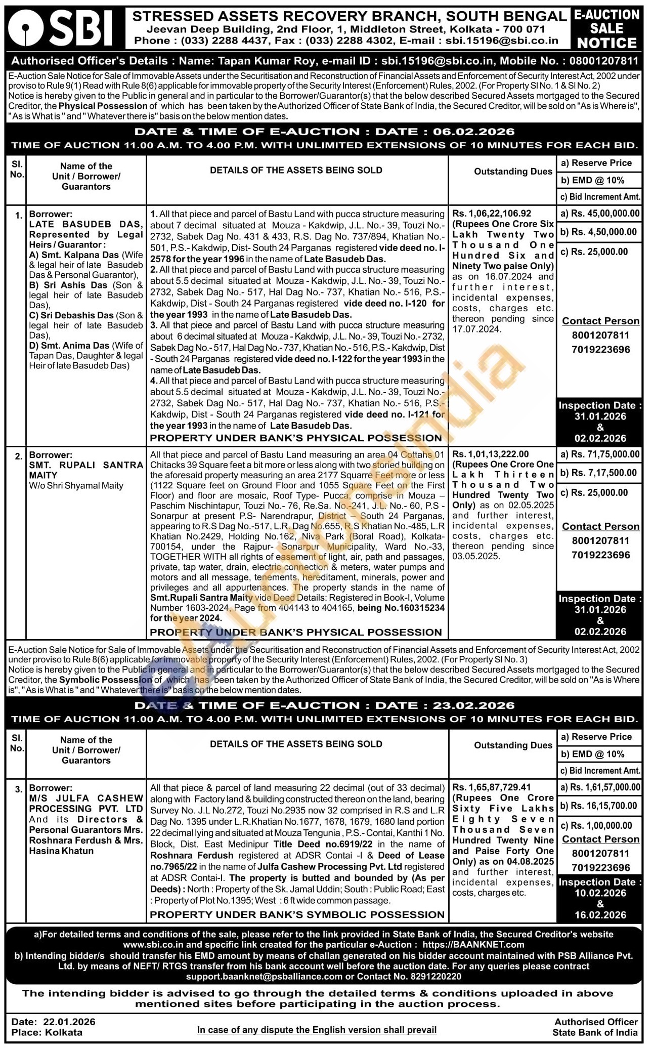 All that piece & parcel of land measuring 22 decimal (out of 33 decimal) along with Factory land & building constructed thereon on the land, bearing Survey No. J.L No.272, Touzi No.2935 now 32 comprised in R.S and L.R Dag No. 1395 under L.R.Khatian No. 1677, 1678, 1679, 1680 land portion 22 decimal lying and situated at Mouza Tengunia, P.S.-Contai, Kanthi 1 No. Block, Dist. East Medinipur Title Deed no.6919/22 in the name of Roshnara Ferdush registered at ADSR Contai -1 & Deed of Lease no.7965/22 in the name of Julfa Cashew Processing Pvt. Ltd registered at ADSR Contai-l. The property is butted and bounded by (As per Deeds): North: Property of the Sk. Jamal Uddin; South: Public Road; East Property of Plot No. 1395; West: 6 ft wide common passage
