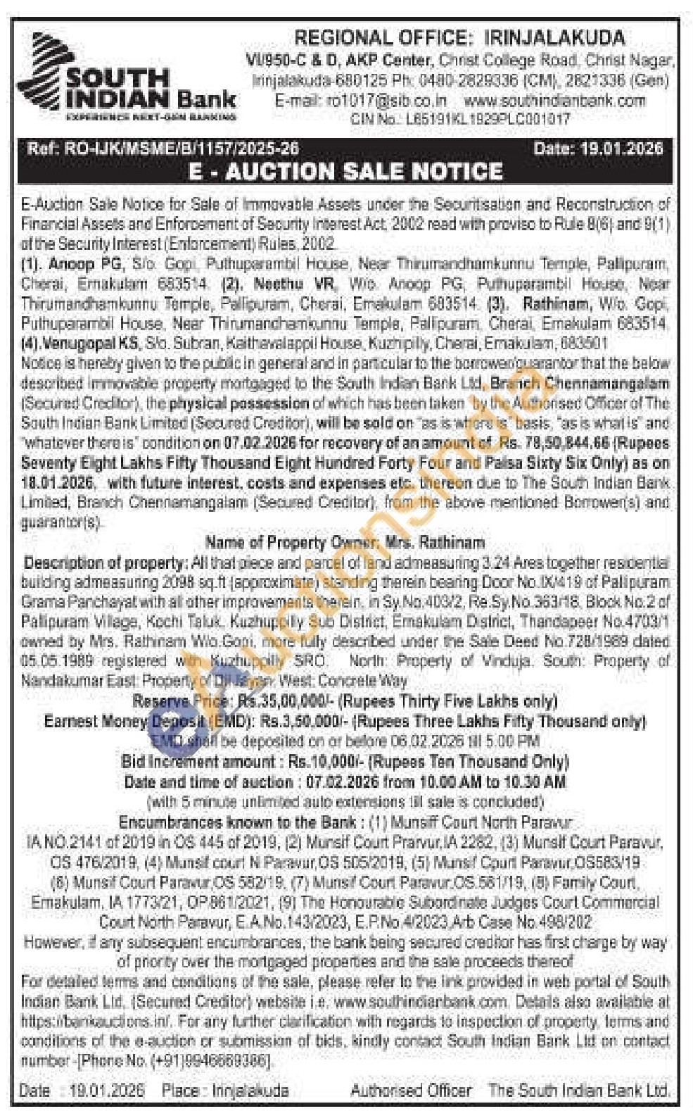 Description of property: All that piece and parcel of land admeasuring 3.24 Ares together residential building admeasuring 2098 sq.ft (approximate) standing therein bearing Door No IX/419 of Palipuram Grama Panchayat with all other improvements therein, in Sy. No.403/2, Re. Sy. No.363/18, Block No.2 of Palipuram Village, Kochi Taluk. Kuzhuppily Sub District, Emakulam District, Thandapeer No.4703/1 owned by Mrs. Rathinam Wio Gopi, more fully described under the Sale Deed No. 728/1989 dated 05.05.1989 registered with Kuzhuppilly SRO. North Property of Vinduja. South: Property of Nandakumar East: Property of Dil Jayan, West: Concrete Way