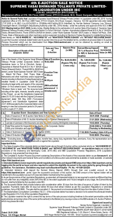Sale of the Assets of the Supreme Vass Shwand Tollways Private Limited (Corporate Debtor) on standabre basis in Toll at Chinchos Kaman Anjurphata to Manikal Road M.S.H. No 4 25/425 in And Takika, Bhiwandi District, Thane (0/000 to 28/425 km stretch) under "Build-Operate-Transfer" (BOT) basis ie Maludi Tol Plaza Distt. Thane, State of Maharastra and other machinery and/or equipment to thereto including to Electronic Fastag Equipments as installed thereto in Liquidation under IBC, 2016 induding is legal entity and assets of the corporate debtor on Asis where is basis", "As is what is basis" Whatever there is base" and "No recourse base including all the rights, interests, benefits aising out of the Project as per the Substitution Agreement dated 25.10.2013 read with the Original Concession Agreement dated 16th May 2009 ('Concession Agreement) and Substitution Agreement dated 23.07.2009 executed by the Corporate Debtor and of keeping in view that concession period is 24 yeam 3 monthsie upto 27.11.2033