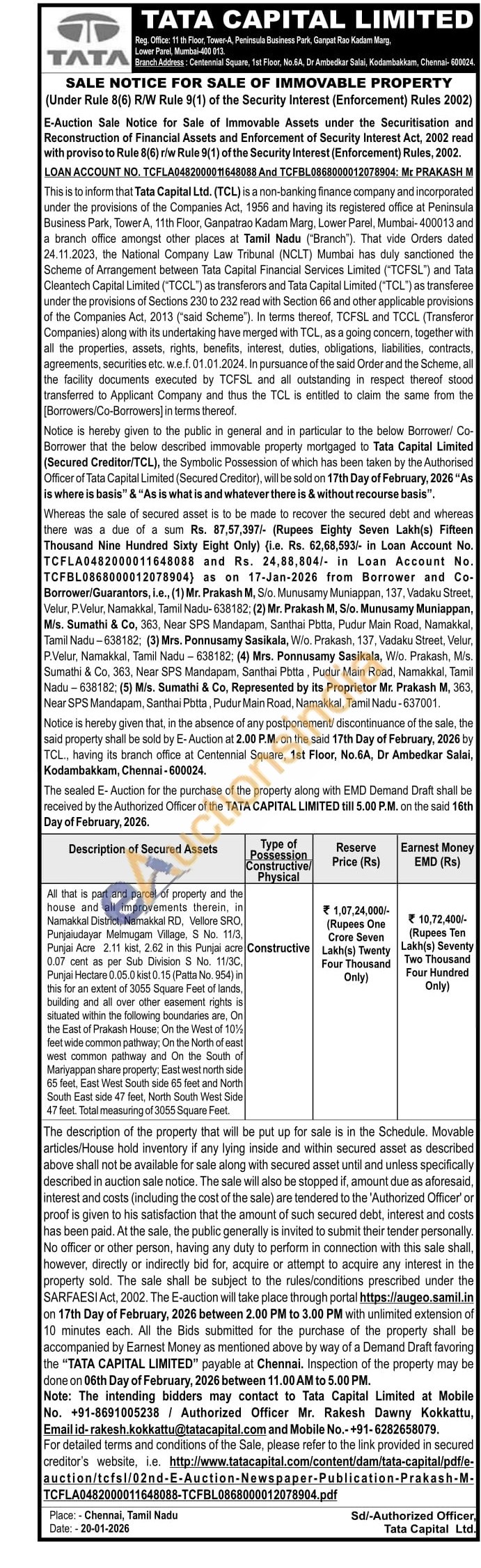 All that is part and parcel of property and the house and all improvements therein, in Namakkal District, Namakkal RD, Vellore SRO, Punjaiudayar Melmugam Village, S No. 11/3, Punjai Acre 2.11 kist, 2.62 in this Punjai acre 0.07 cent as per Sub Division S No. 11/3C, Punjai Hectare 0.05.0 kist 0.15 (Patta No. 954) in this for an extent of 3055 Square Feet of lands, building and all over other easement rights is situated within the following boundaries are, On the East of Prakash House; On the West of 10% feet wide common pathway; On the North of east west common pathway and On the South of Mariyappan share property; East west north side 65 feet, East West South side 65 feet and North South East side 47 feet, North South West Side 47 feet. Total measuring of 3055 Square Feet