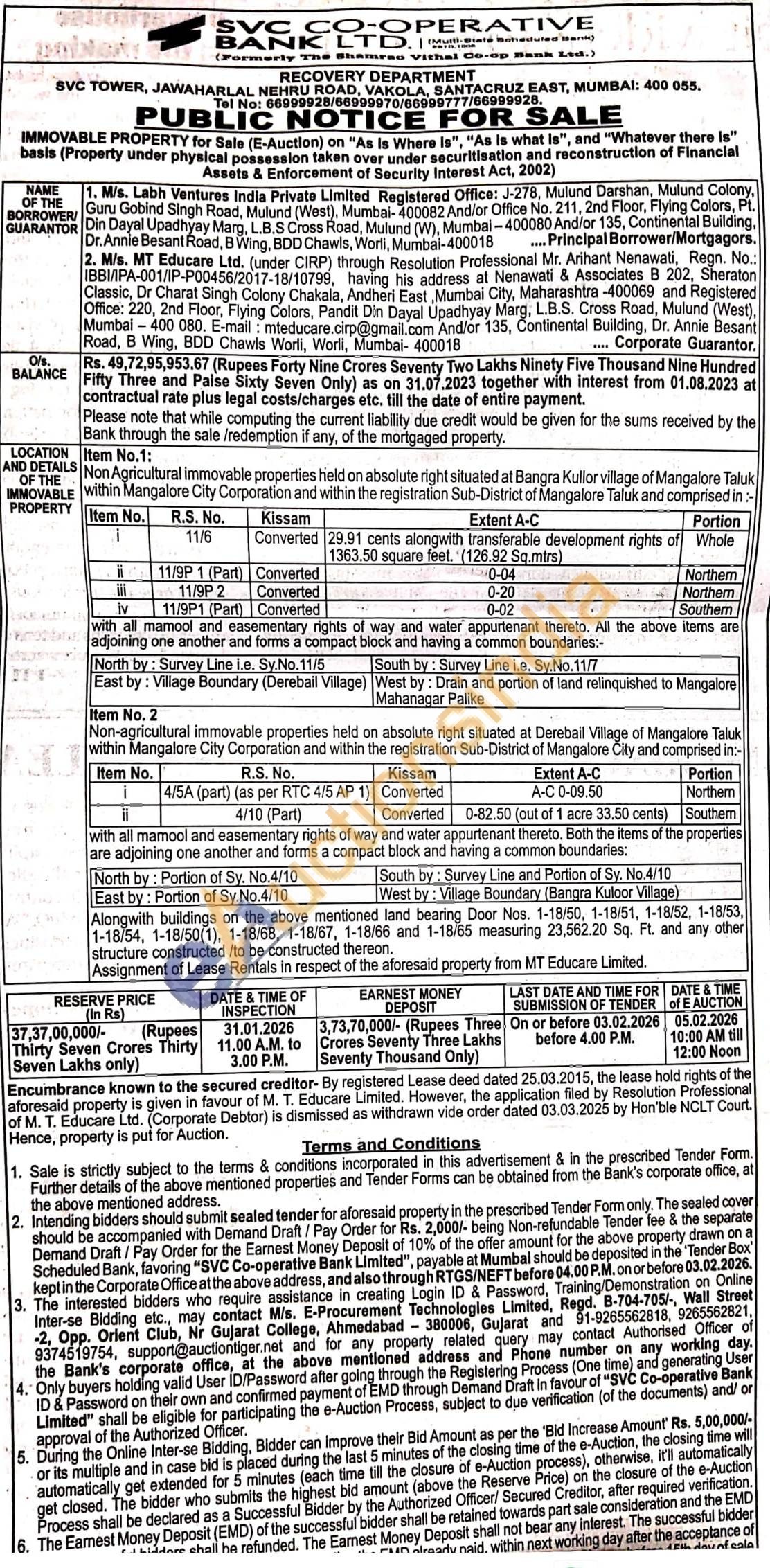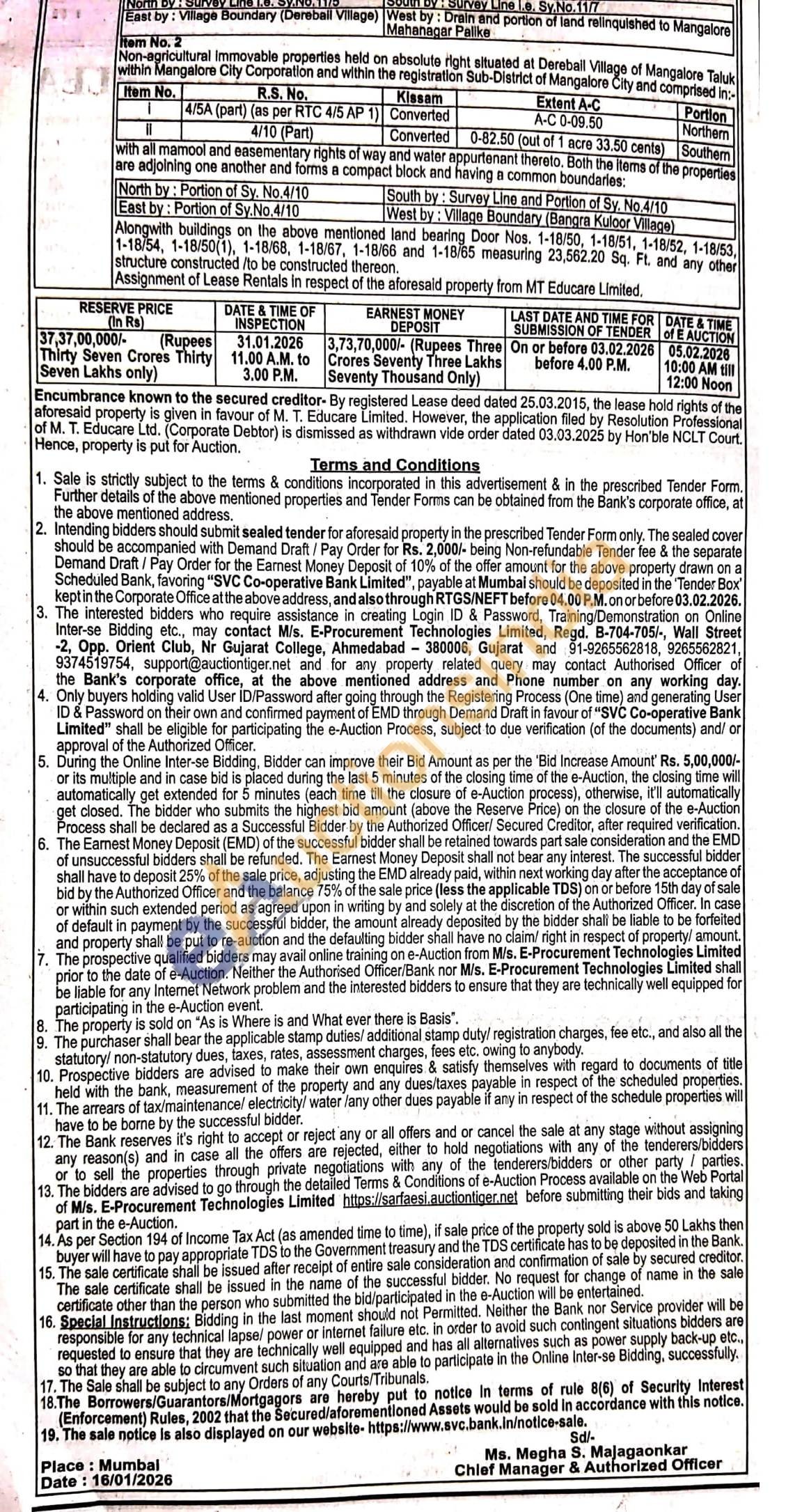 Non Agricultural immovable properties held on absolute right situated at Bangra Kullor village of Mangalore Taluk within Mangalore City Corporation and within the registration Sub-District of Mangalore Taluk and comprised in:- PROPERTY Item No. R.S. No. 11/6 Kissam Converted Extent A-C 29.91 cents alongwith transferable development rights of 1363.50 square feet. (126.92 Sq.mtrs) Portion Whole 11/9P 1 (Part) Converted 0-04 iii Northern 11/9P 2 Converted 0-20 iv Northern 11/9P1 (Part) Converted 0-02 Southen with all mamool and easementary rights of way and water appurtenant thereto. All the above items are adjoining one another and forms a compact block and having a common boundaries:- North by: Survey Line i.e. Sy.No.11/5 South by: Survey Line i.e. Sy.No.11/7 East by: Village Boundary (Derebail Village) West by: Drain and portion of land relinquished to Mangalore Mahanagar Palike