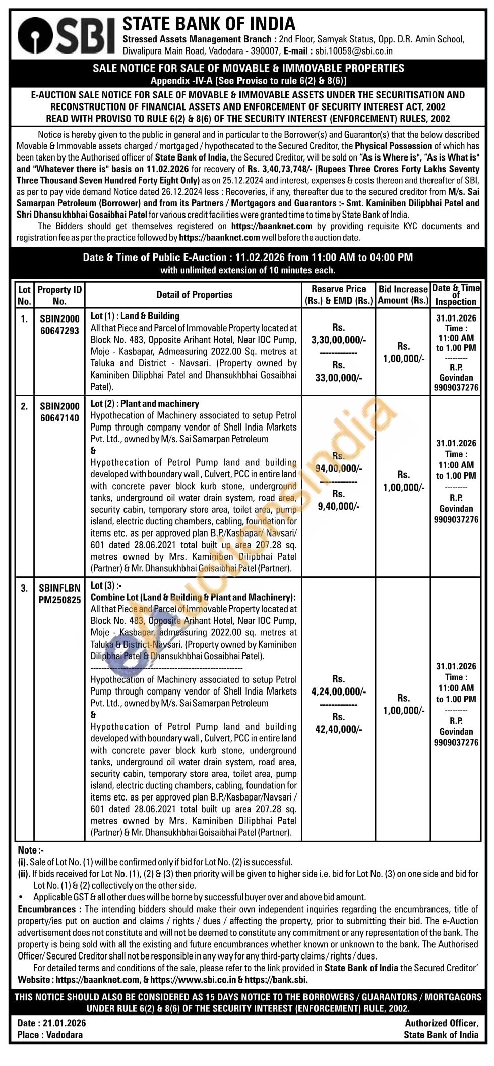 Lot (1): Land & Building All that Piece and Parcel of Immovable Property located at Block No. 483, Opposite Arihant Hotel, Near IOC Pump, Moje Kasbapar, Admeasuring 2022.00 Sq. metres at Taluka and District Navsari. (Property owned by Kaminiben Dilipbhai Patel and Dhansukhbhai Gosaibhai Patel).
