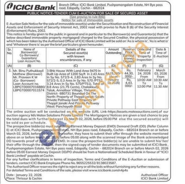 3 Bhk House With Land Area 9470 in Built Up Area of 1200 Sq.ft In 2.43 Ares In Sy No. 572/3-4, 2.83 Ares In Sy No. 572/2-5, 0.3 Ares In Sy No. 570/PT52, 3.24 Ares in Sy No. 570/PT51), Total of 8.8 Ares (21.75 Cents), Chalakkudy Taluk, Annalloor Village, Thrissur District-680731 Bounded On The North: Property of Thoppil Janaki South: Private Pathway East: Property of Thoppil Janaki And Private Pathway West: Panchayath Road