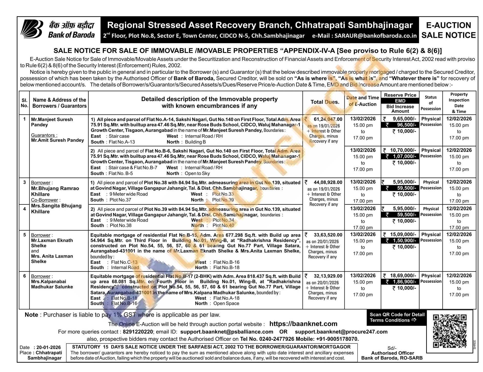 1) All piece and parcel of Flat No.A-14, Sakshi Nagari, Gut No. 140 on First Floor, Total Adm. Area 75.91 Sq.Mtr. with builtup area 47.46 Sq.Mtr, near Rose Buds School, CIDCO, Waluj Mahanagar-1 Growth Center, Tisgaon, Aurangabad in the name of Mr.Manjeet Suresh Pandey, Boundaries East Stair case West Internal Road/RH North Building B South: Flat No.A-13