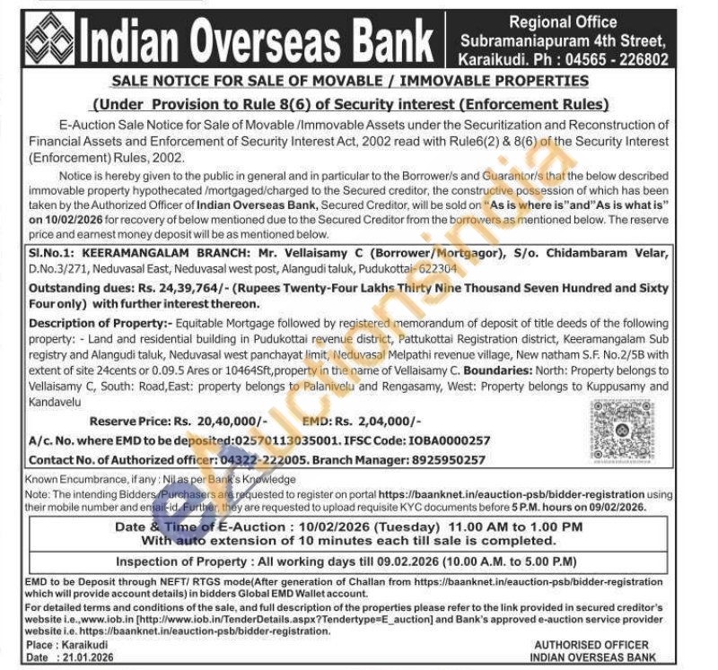 Description of Property:- Equitable Mortgage followed by registered memorandum of deposit of title deeds of the following property: Land and residential building in Pudukottai revenue district, Pattukottai Registration district, Keeramangalam Sub registry and Alangudi taluk, Neduvasal west panchayat limit, Neduvasal Melpathi revenue village, New natham S.F. No.2/5B with extent of site 24 cents or 0.09.5 Ares or 10464Sft, property in the name of Vellaisamy C. Boundaries: North: Property belongs to Vellaisamy C, South: Road, East: property belongs to Palanivelu and Rengasamy, West: Property belongs to Kuppusamy and Kandavelu