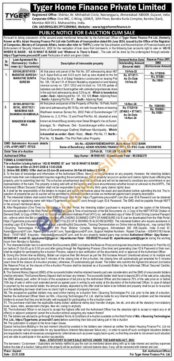Al that piece and parcel of the Flat No. 307 admeasuring about 667 ft. Supar Bultus and 3303 samt built up ama situated on the 3rd Floor Bulding No-A of Balai Residency constructed on bearing Pial No. 129, 130 and 131 of Shivam Residency organized on land bearing revenue survey no. 120/1 120/2 and its black no. 104,105 paikee of kadodara sub district Surat together with undivided proportzionale share in the said land admeasing about 5.29 sgnt. Which is bounded as under East Adjoining pilot No. 131, 130, 129, West Adjoining Road North-Adoining Plot No. 97., South-Adjoining Road