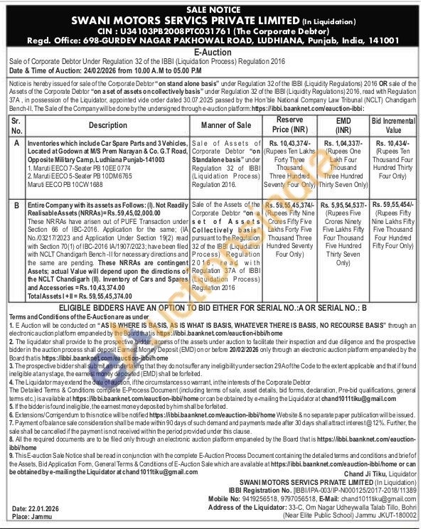 Inventories which include Car Spare Parts and 3 Vehicles, Located at Godown at M/S Prem Narayan & Co. G.T Road, Opposite Military Camp, Ludhiana Punjab-141003