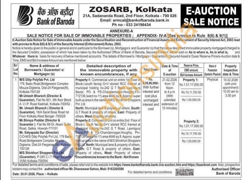 Property-1: Commercial unit on entire 1st Floor of Block-l.south facing G+V storied RCC framed at municipal holding no-242 GT Road, Laxmigunj Bazar, PO & PS-Chandannagar, Hooghly, Pin-712136 (ward no-11) area 4646 sq.ft. Approx. super built up area in the name of M/S Shivkhori Shoppers Pvt. Ltd. North: Municipal lane & property of others, South: G.T Road & property of others, East: Property of others, West: Property of others