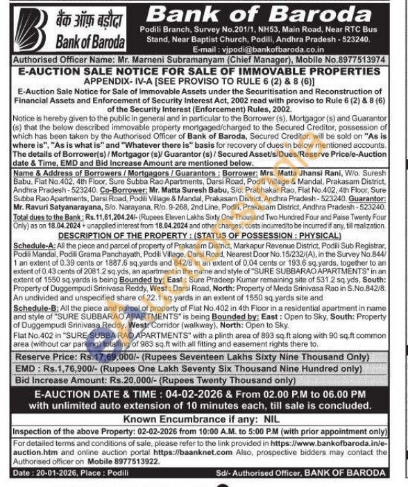 Schedule-A: All the piece and parcel of property of Prakasam District, Markapur Revenue District, Podili Sub Registrar, Podili Mandal, Podil Grama Panchayath, Podili Village, Darsi Road, Nearest Door No. 15/232/(A), in the Survey No.844/1 an extent of 0.39 cents or 1887.6 sq.yards and 842/8 in an extent of 0.04 cents or 193.6 sq yards, together to an extent of 0.43 cents of 2081.2 sq.yds, an apartment in the name and style of "SURE SUBBARAO APARTMENTS" in an extent of 1550 sq.yards is being Bounded by: East: Sure Pradeep Kumar remaining site of 531.2 sq.yds, South: Property of Duggempudi Srinivasa Reddy, West: Darsi Road, North: Property of Meda Srinivasa Rao in S.No.842/8. An undivided and unspecified share of 22.1 sq.yards in an extent of 1550 sq yards site and Schedule-B: All the piece and parcel of property of Flat No.402 in 4th Floor in a residential apartment in name and style of "SURE SUBBARAO APARTMENTS" is being Bounded by: East: Open to Sky, South: Property of Duggempudi Srinivasa Reddy, West: Corridor (walkway), North: Open to Sky. Flat No.402 in "SURE SUBBA RAO APARTMENTS" with a plinth area of 893 sq ft along with 90 sq.ft common area (without car parking) totalling of 983 sq.ft with all fitting and easement rights there to.