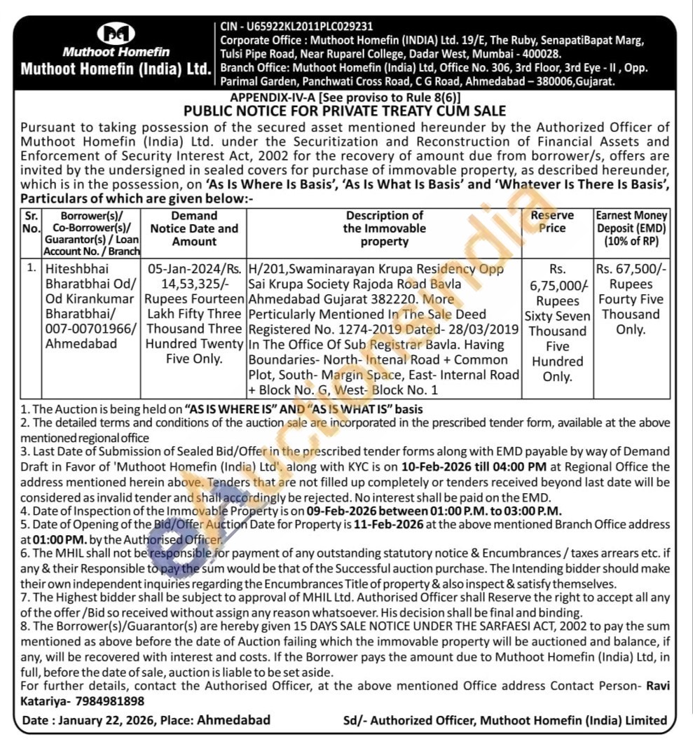 H/201,Swaminarayan Krupa Residency Opp Sai Krupa Society Rajoda Road Bavla Ahmedabad Gujarat 382220. More Perticularly Mentioned In The Sale Deed Registered No. 1274-2019 Dated- 28/03/2019 In The Office Of Sub Registrar Bavla. Having Boundaries- North- Intenal Road + Common Plot, South- Margin Space, East- Internal Road + Block No. G, West- Block No. 1