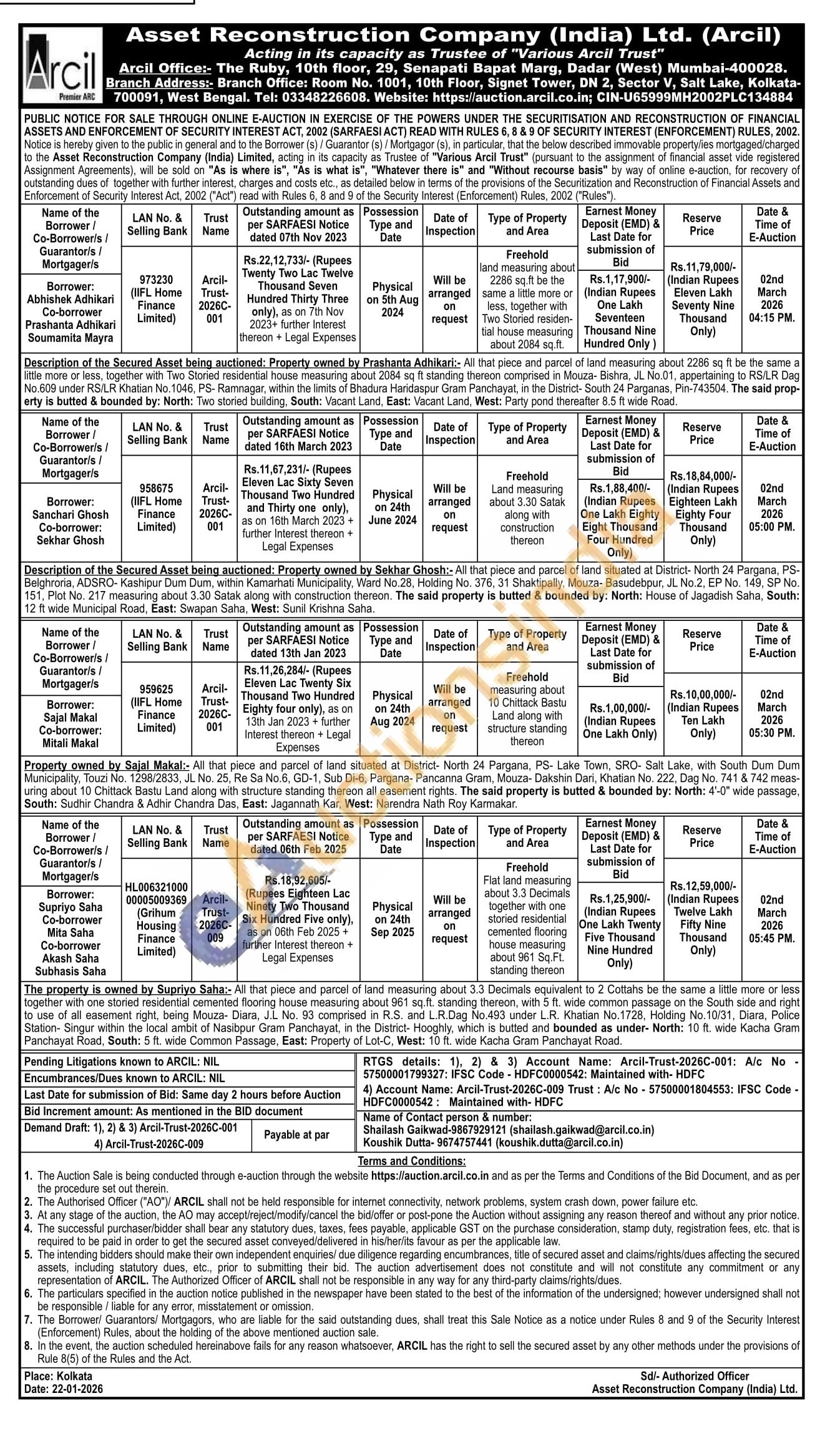 Description of the Secured Asset being auctioned: Property owned by Sekhar Ghosh:- All that piece and parcel of land situated at District- North 24 Pargana, PS-Belghroria, ADSRO- Kashipur Dum Dum, within Kamarhati Municipality, Ward No.28, Holding No. 376, 31 Shaktipally, Mouza- Basudebpur, JL No.2, EP No. 149, SP No. 151, Plot No. 217 measuring about 3.30 Satak along with construction thereon. The said property is butted & bounded by: North: House of Jagadish Saha, South: 12 ft wide Municipal Road, East: Swapan Saha, West: Sunil Krishna Saha