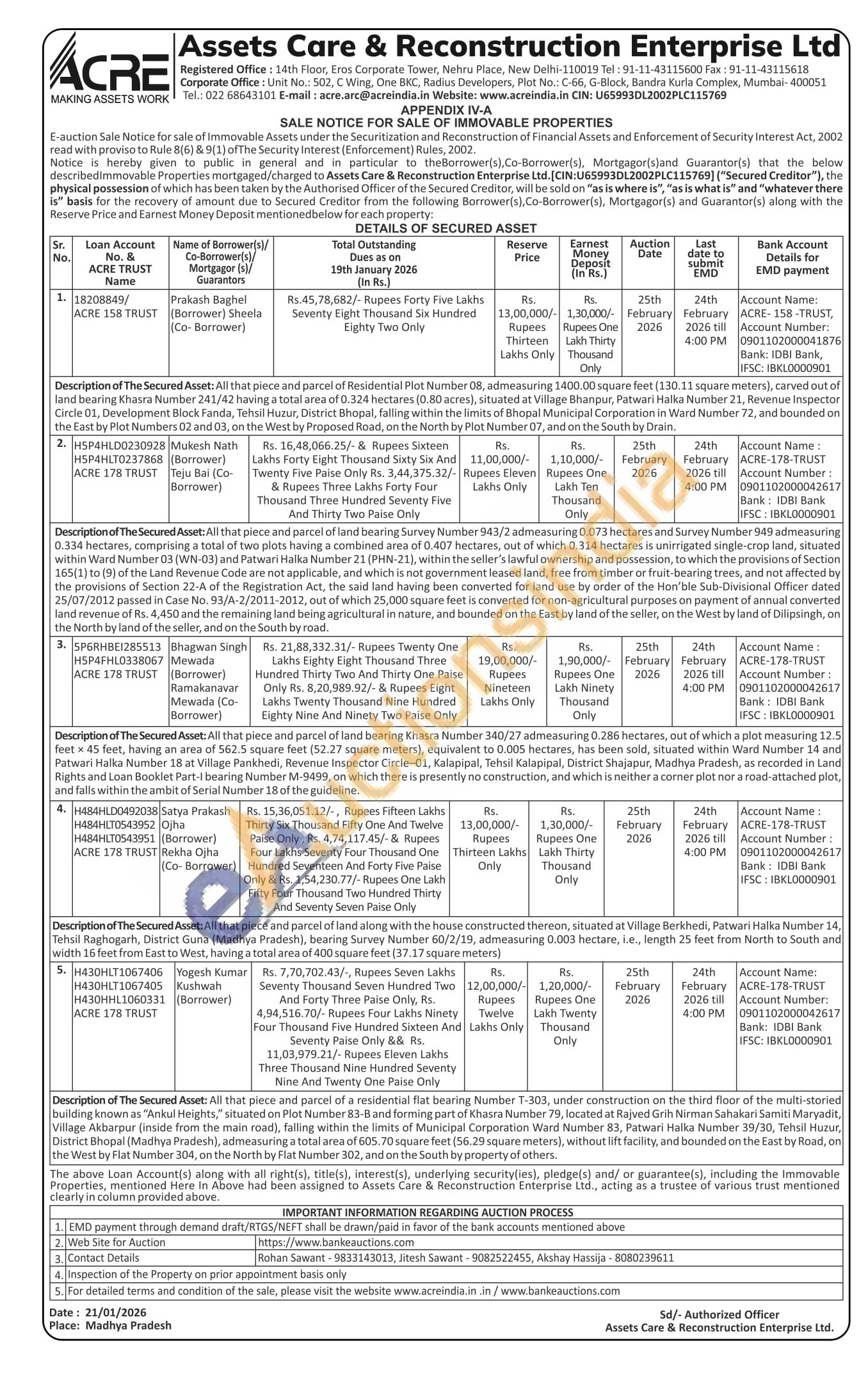 Description of The Secured Asset: All that piece and parcel of Residential Plot Number 08, admeasuring 1400.00 square feet (130.11 square meters), carved out of land bearing Khasra Number 241/42 having a total area of 0.324 hectares (0.80 acres), situated at Village Bhanpur, Patwari Halka Number 21, Revenue Inspector Circle 01, Development Block Fanda, Tehsil Huzur, District Bhopal, falling within the limits of Bhopal Municipal Corporation in Ward Number 72, and bounded on the East by Plot Numbers 02 and 03, on the West by Proposed Road, on the North by Plot Number 07, and on the South by Drain.
