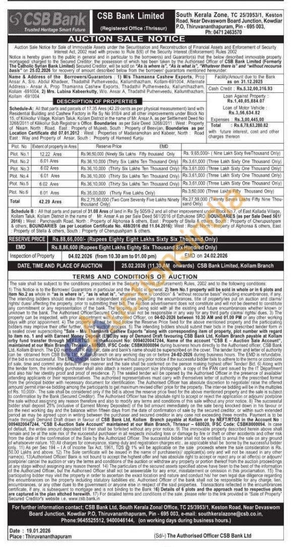 Schedule-A: All that parts and parcels of 17.35 Ares (42.29 cents as per physical measurement) land with Residential Building and Cashew Factory in Re Sy No-918/4 and all other improvements under Block No 15. of Kilkollur Village, Kollam Taluk, Kollam District in the name of Mr. Ansar A, as per Settlement Deed No 3288/2011 of Kikosilur Sub Registrar Office Boundaries as per Sale Deed 3268/2011 West Property of Nisam, North Road East Property of Mujeeb, South Property of Beevjan, Boundaries as per Location Certificate dtd 07.01.2012 West. Properties of Madanamohan and Kabeer, North Road East Way and Property of Ansar, South Property of Hameed Kunju
