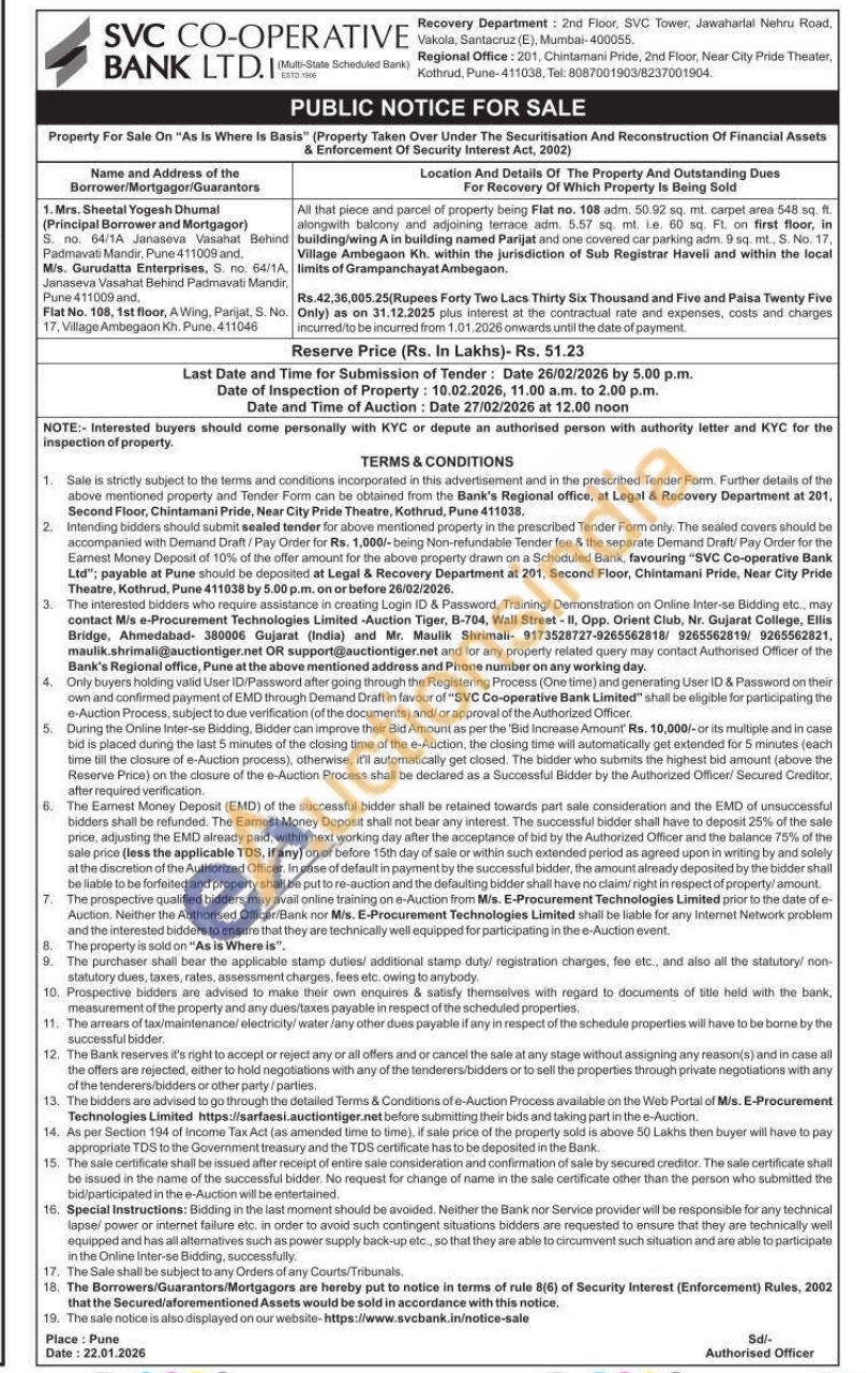 All that piece and parcel of property being Flat no. 108 adm. 50.92 sq. mt. carpet area 548 sq. ft. alongwith balcony and adjoining terrace adm, 5.57 sq. mt ie. 60 sq. Ft, on first floor, in building/wing A in building named Parijat and one covered car parking adm. 9 sq. mt. S. No. 17, Village Ambegaon Kh. within the jurisdiction of Sub Registrar Haveli and within the local limits of Grampanchayat Ambegaon.
