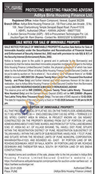 ALL THAT PIECE AND PARCEL OF FLAT NO. 303, ON THE THIRD FLOOR, ADMEASURING 35.71 SQ. MTRS. (IE 3208++ ENCLOSED BALCONY 3.63 SQ MTRS TERRACE 2.51 SQ MTRS) CARPET AREA IN WING-A, IN PROJECT KNOWN AS SAI NISARG CONSTRUCTED ON THE PROPERTY BEARING FROM OUT OF PORTION OF LAND ADMEASURING ABOUT HECTARE 36 ARES, AND FROM OUT OF TOTAL LAND BEARING S.NO. 97, HISSA NO. A/1, OF VILLAGE SHIVANE, TAL HAVELI, DIST. PUNE, SITUATE WITHIN THE REGISTRATION DISTRICT OF PUNE, REGISTRATION SUB-DISTRICT OF TALUKA HAVELI, WITHIN THE LIMITS OF SUB REGISTRAR, HAVELINOS 1 TO 27, PUNE, AND SITUATE WITHIN THE REVENUE LIMITS OF PUNE MUNICIPAL CORPORATION, MAHARASHTRA-411023, AND BOUNDED AS EAST BY PORTION LAND OF MR ROHIDAS DESHMUKH, WEST BY NALA, NORTH BY PORTION LAND OF MR. ROHIDAS DESHMUKH AND THEREAFTER NALA, SOUTH: BY PORTION LAND OF MIS SNEHA CONSTUCTIONS