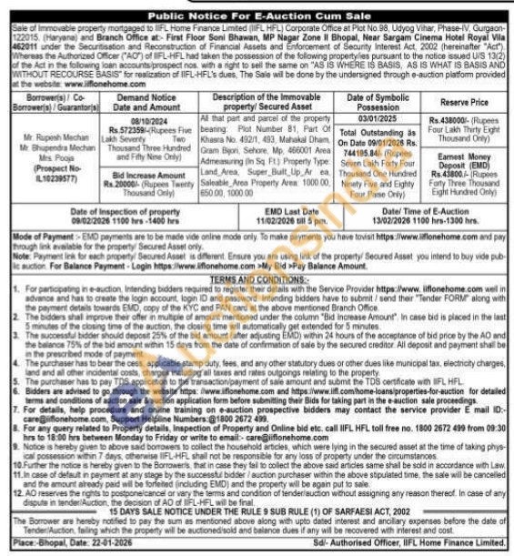 All that part and parcel of the property beaning. Plot Number 81, Part Of Khaura No. 452/1, 403, Mahakal Dham. Gram Bijori. Sehore, Mp. 486001 Area Admeasuring in Sq. Ft) Property Type Land Area, Super Built Up, Ar ea. Saleable Area Property Area: 1000.00. 650.00 1000.00