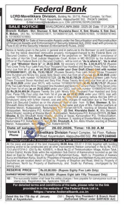 All the piece and parcel of the land measuring 04.86 Ares (03.22+01.64) together with braiding existing andior to be constructed and at other improvements thereon comprised in Re-Sy No. 613 13-3 and 613/14-3 (Old Sy No. 42098/1), in Block No 22 of Trikkoviivattom Village, Kolam Taluk Kollam District, Kerala State within the registration Sub District of Kannanalloor bounde bounded as per title deed on East by Road, West try: Property of Muhammed Kunju, North by Properties of Asanaru Kunju and Maitheen Kunju, South by Properties of Haneefa Kunju and Maitheen Kunju and commonly bounded as per location sketch on East by Property of Shajahan and Road, West by Property of Saifudheen, North by: Property of Basheerkuty, and South by Pathway. (mortgaged by 3rd among you)