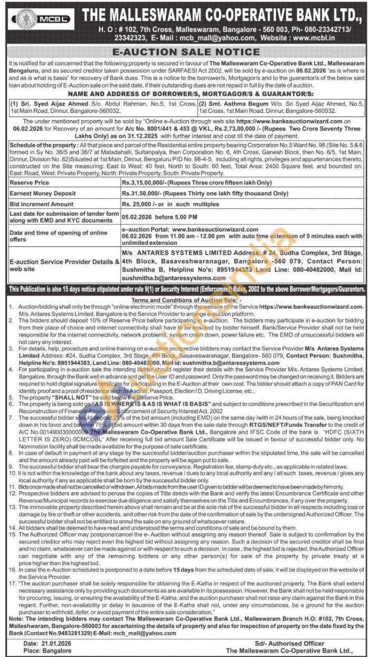 Schedule of the property: All that piece and parcel of the Residential entire property bearing Corporation No.5 Ward No. 98 (Site No. 5&6 formed in Sy No. 36/5 and 36/7 at Matadahalli, Sultanpalya, then Corporation No. 6, 4th Cross, Ganesh Block, then No. 6/5, 1st Main, Dinnur, Division No. 82)Situated at 1st Main, Dinnur, Bengaluru PID No. 98-4-5, including all rights, privileges and appurtenances thereto, constructed on the Site measuring. East to West: 40 feet, North to South: 60 feet, Total Area: 2400 Square feet and bounded on East: Road, West: Private Property, North: Private Property, South: Private Property.