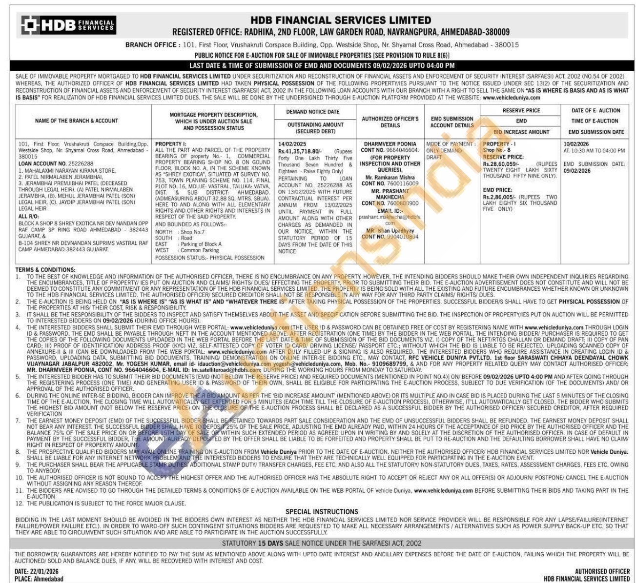 ALL THE PART AND PARCEL OF THE PROPERTY BEARING OF property No. 1, COMMERCIAL PROPERTY BEARING SHOP NO. 8 ON GOUND FLOOR BLOCK NO. A IN THE SCHEME KNOWN AS "SHREY EXOTICA, SITUATED AT SURVEY NO 753, TOWN PLANING SCHEME NO 114, FINAL PLOT NO. 16, MOLJE VASTRAL, TALUKA VATVA DIST & SUB DISTRICT AHMEDABAD (ADMEASURING ABOUT 32.88 SQ. MTRS, SBUA) HERE TO AND ALONG WITH ALL ELEMENTARY RIGHTS AND OTHER RIGHTS AND INTERESTS IN RESPECT OF THE SAID PROPERTY. AND BOUNDED AS FOLLOWS