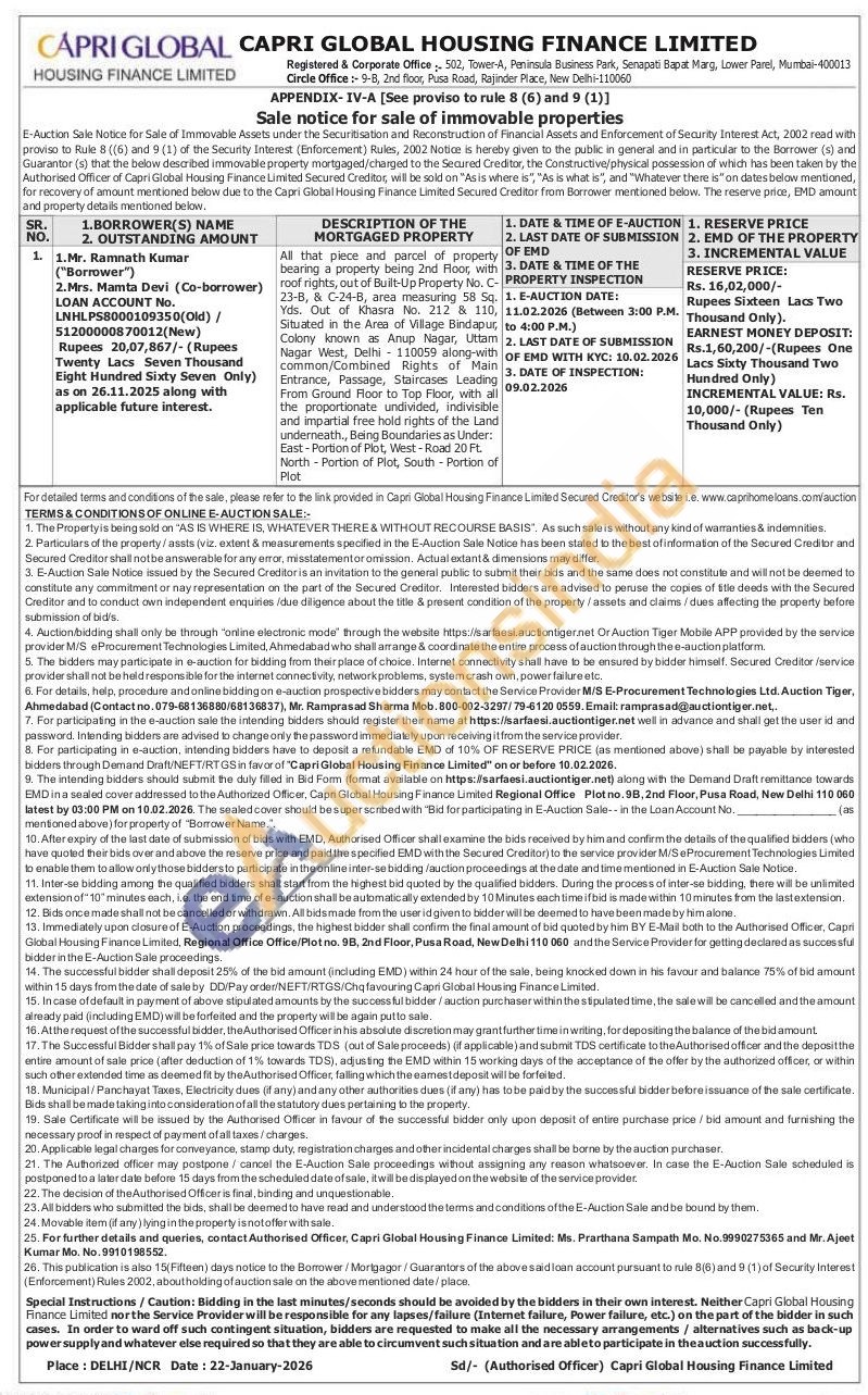 All that piece and parcel of property bearing a property being 2nd Floor, with roof rights, out of Built-Up Property No. C 23-8, & C-24-B, area measuring 58 Sq. Yds. Out of Khasra No. 212 & 110, Situated in the Area of Village Bindapur, Colony known as Anup Nagar, Uttam Nagar West, Delhi 110059 along with common/Combined Rights of Main Entrance, Passage, Staircases Leading From Ground Hoor to Top Floor, with all 09.02.2026 the proportionate undivided, indivisible and impartial free hold rights of the Land underneath, Being Boundaries as Under: East-Portion of Plot, West-Road 20 Ft North-Portion of Plot, South-Portion of Plot