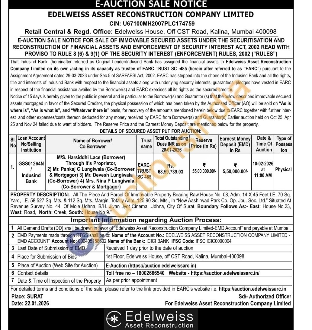PROPERTY DESCRIPTION:. All The Piece And Parcel Of Immovable Property Bearing Raw House No. 08, Adm. 14 X 45 Feet I.E. 70 Sq. Yard, I.E. 58.527 Sq. Mts. & 112 Sq. Mts. Margin, Totally Adm. 125.90 Sq. Mts., In "New Aashirwad Park Co. Op. Jou. Soc. Ltd." Situated At Revenue Survey No. 44, Of Moje Udhna, B/H. Jivan Jyot Cinema, Udhna, City Of Surat. Boundary Follows As:- East: House No.23, West: Road, North: Creek, South: House No 9."