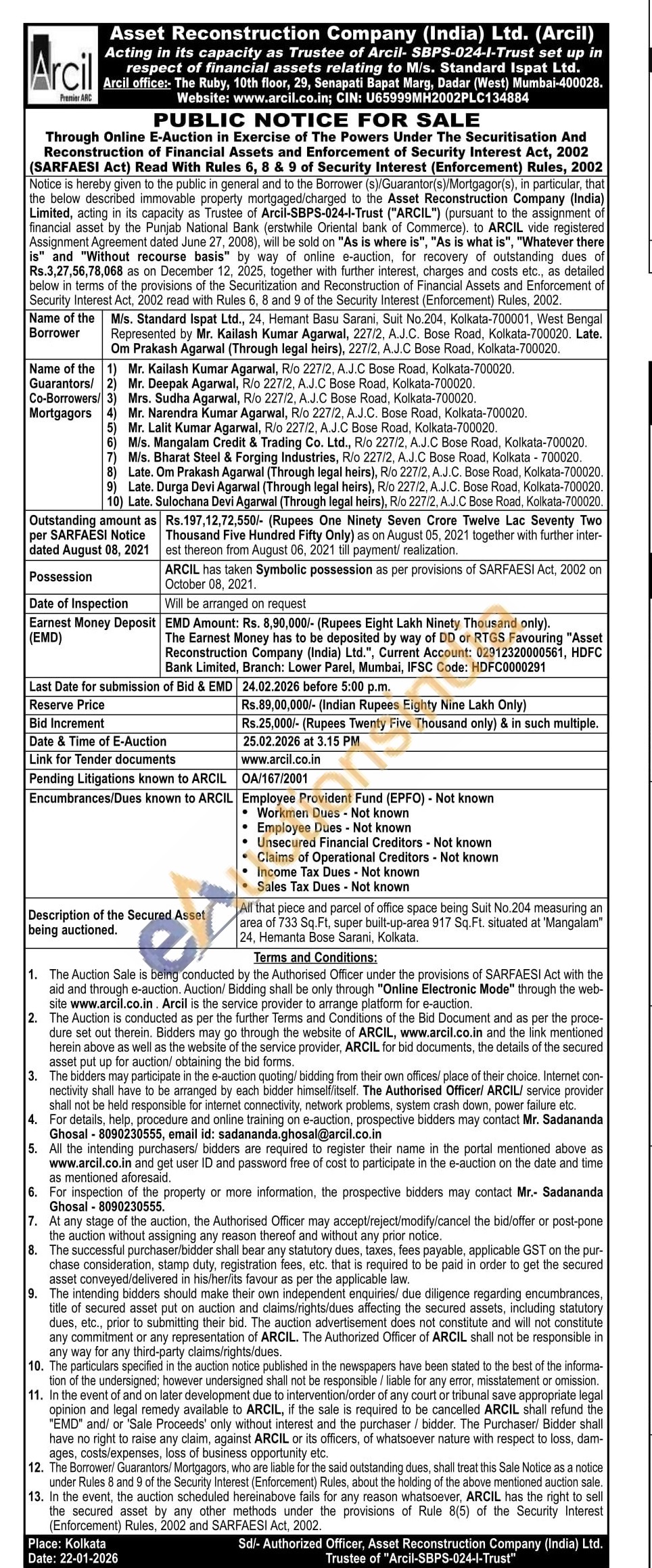 All that piece and parcel of office space being Suit No.204 measuring an area of 733 Sq Ft, super bull-up-area 917 Sq. Fl. situated at "Mangalam" 24. Hemanta Bose Sarani, Kolkata