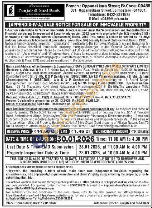 Detailed description of the immovable property with known encumbrances if any: All the piece and parcel of property bearing TS No 5,0ld Survey number 439/A2&439/B2, part of bearing Door No 52A at Tenkashi Road, Kothankulam village, Rajapalayam Taluk and Municipality, Virudanagar District measuring 1 Acres and 25.5 cents of site and industrial building thereon with all amenities and all appurtenances etc., in the name of M/s. Janakiram Mills Ltd Property Bounded as: Noth:TS No 5part (Sold property of Pillayar Nadar), East TS No.28 belongs to Janakiram Mills, South: Railway Road, West: TS No 5 Part belongs to Janikram Mills.