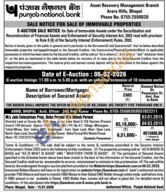 Diverted Land at Survey No. 659, Area as per Sake Deed 0.158 Hectare (Present Area-0.149 Hectare) Approx 1495.378 Sq. Mtr.) PH. No.4/1, Village- Mhowgaon Tehsil Mhow, Dist- Indore (MP), Boundaries: East- Open Land, West- Open Land, North-Open Land, South-Road, Property Owner: Neha Porwal W/o Nitesh Powal (Note: RC 229/2016 Pending in DRT Jabalpur)