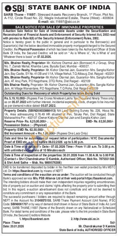 Property Details. (SBIN200033888413) NA Land Bearing Survey No. 226, Hissa No. 1A, Area admeasuring 0.76.49 HR situated at Pen, Taluka Pen, Dist Raigad, State Maharashtra Pin-402107 (Owner Kishore Otarmal Jain and Sangita Kishor Jain)