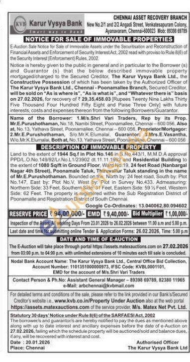 Land to the extent of 1944 Sq.f in Plot No.146 in S.No.443/1, M.M.D.A approval PPD/LO.No 149/92/Lr.No.L.1/23902 dt. 11.11.1992 and Residential Building to the extent of 1080 Sq/ft in Ground Floor, Ward No. 19, 24 feet Road (Nanbargal Nagar 4th Street), Poonamale Taluk, Thiruvallur Taluk standing in the name of Mr.E.Purushothaman. Bounded on the North by: 24 feet road, South by: Plot No.147, East by: Plot No.V. West by: Plot in Survey No.433. Admeasuring: Northern Side: 33 Feet, Southern Side: 31 Feet, Eastern Side: 59 1% Feet, Western Side: 62 Feet. The property is registered within the Sub Registration District of Poonamalle and Registration District of South Chennai