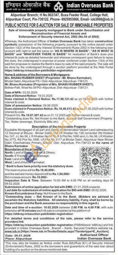 Equitable Mortgaged of all part and parcel of demarcated Vacant Land admeasuring 12 Decimal at Mouza-Bholar Dabri, Old LR Khatian No. 138 corrected Old Khatian No. 147, JL No.56, LR Khatian No.3776, RS Plot No. 1690 and JL No.56, LR Khatian No.3775, RS Plot No. 1690, LR Plot No.3117 at Bholar Dabri, Alipurduar Near Bholar Dabri Chechakhata Primary School, Dist- Alipurduar, Pin-736123 in the name of Bhanu Karmakar
