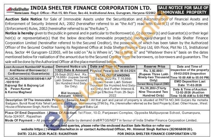 Description Of The Immovable Property/ Secured Asset: All that part and parcel of property is situated at PATTA NO.346 Gurjaro Ka mohalla Badgaon, Bundi Road Kota Tehsil Ladpura, Dist Kota, admeasuring 2796 Sq. Fts. (Hereinafter referred as the Said Property) East: Other House., West: House of Mahaveer Singh, North: Road South: House of Babu Lal
