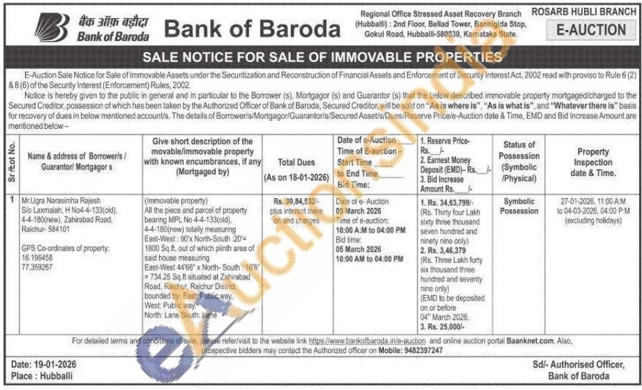 (Immovable property) All the piece and parcel of property bearing MPL No 4-4-133(old) 4-4-180(new) totally measuring East-West: 90'x North-South 20 1800 Sq.ft, out of which plinth area of said house measuring East-West 44'66' North-South 16'5" = 734.25 Sq. It situated at Zahirabad Road, Raichur, Raichur District bounded by: East Public way, West Public way North: Lane South: Lane