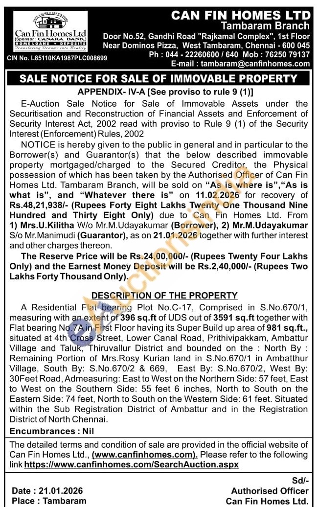 A Residential Flat bearing Plot No.C-17, Comprised in S.No.670/1, measuring with an extent of 396 sq.ft of UDS out of 3591 sq.ft together with Flat bearing No.7A in First Floor having its Super Build up area of 981 sq.ft., situated at 4th Cross Street, Lower Canal Road, Prithivipakkam, Ambattur Village and Taluk, Thiruvallur District and bounded on the North By: Remaining Portion of Mrs. Rosy Kurian land in S.No.670/1 in Ambatthur Village, South By: S.No.670/2 & 669, East By: S.No.670/2, West By: 30Feet Road, Admeasuring: East to West on the Northern Side: 57 feet, East to West on the Southern Side: 55 feet 6 inches, North to South on the Eastern Side: 74 feet, North to South on the Western Side: 61 feet. Situated within the Sub Registration District of Ambattur and in the Registration District of North Chennai.