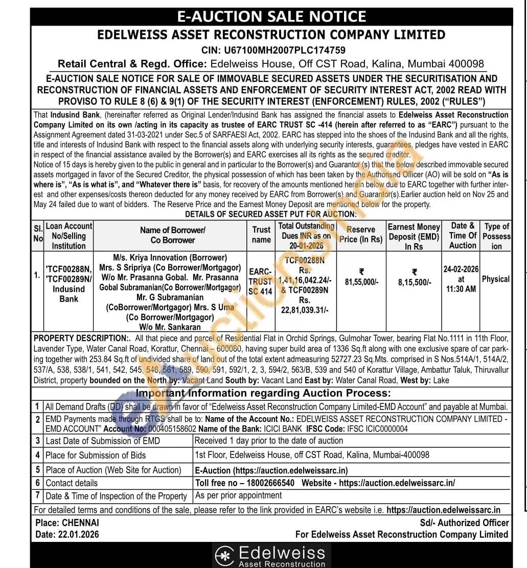 PROPERTY DESCRIPTION:. All that piece and parcel of Residential Flat in Orchid Springs, Gulmohar Tower, bearing Flat No. 1111 in 11th Floor, Lavender Type, Water Canal Road, Korattur, Chennai-600080, having super build area of 1336 Sq.ft along with one exclusive spare of car park-ing together with 253.84 Sq.ft of undivided share of land out of the total extent admeasuring 52727.23 Sq.Mts. comprised in S Nos.514A/1, 514A/2, 537/A, 538, 538/1, 541, 542, 545, 546, 561, 589, 590, 591, 592/1, 2, 3, 594/2, 563/B, 539 and 540 of Korattur Village, Ambattur Taluk, Thiruvallur District, property bounded on the North by: Vacant Land South by: Vacant Land East by: Water Canal Road, West by: Lake