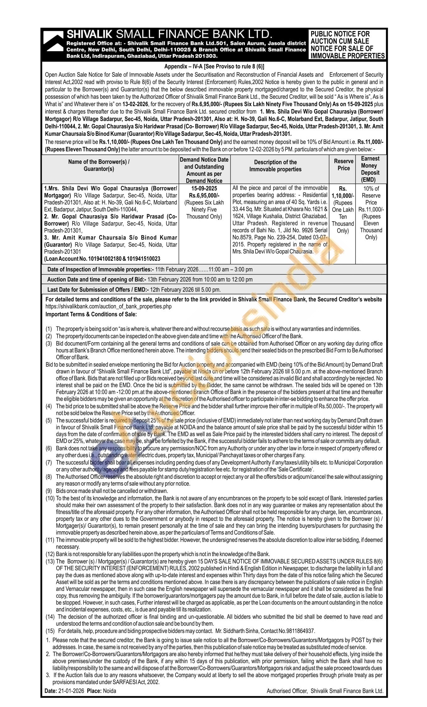 All the piece and parcel of the immovable properties bearing address Residential Plot, measuring an area of 40 Sq. Yards ie. 33.44 Sq. Mtr. Situated at Khasra No. 1621 & 1624, Village Kushalia, District Ghaziabad, Uttar Pradesh Registered in revenue records of Bahi No. 1, Jild No. 9926 Serial No.8579, Page No. 230-254, Dated 03-07-2015. Property registered in the name of Mrs. Shila Devi Win Gopal Chaurasia