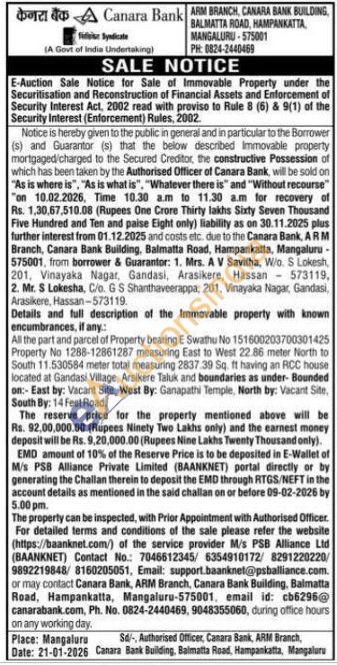All the part and parcel of Property bearing E Swathu No 151600203700301425 Property No 1288-12861287 measuring East to West 22.86 meter North to South 11.530584 meter total measuring 2837.39 Sq. ft having an RCC house located at Gandasi Village, Arsikere Taluk and boundaries as under- Bounded on:- East by: Vacant Site, West By: Ganapathi Temple, North by: Vacant Site, South By: 14 Feet Road