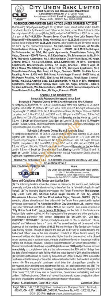 All that piece and parcel of 738 Sqft. of UDS of land out of the total extent of 39.264 Soft logither with Fiat No. 15. B Block, 4th Floor, with a plinth area of 1.475 Sq it with one open car parking No 5 at Metro Pols, No. 1. Bharathidasan Street, KK Nagar, Chennai 600078 comprised in 0.5 Nos 301/1.2.3 part 295/1 and 2. 296 part and 29771 part. 7.S.No. 14/2 part, Block No. 129 of Kodamburkam Village and Bounded on the North by: Land in TS. No 14, South by Bharathidasan Salai, East by: Land in TS.Nos. 15 and 19. West by: Land in T.S. Nos. 12 and 7 and lying within the Sub Registration District of Ashok Nagar and Registration District of Central Chennal
