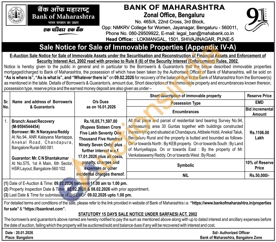 All that piece and parcel of residential land bearing Survey No.94, admeasuring area 30 Guntas together with buildings constructed thereon lying and situated at Chandapura, Attibele Hobli, Anekal Taluk, Bengaluru Rural and the property is butted and bounded as follows-On or towards North: By KEB property. On or towards South: By Land of Muniyellappa. On or towards East By the property of Mr. Venkataswamy Reddy. On or towards West: By Road.